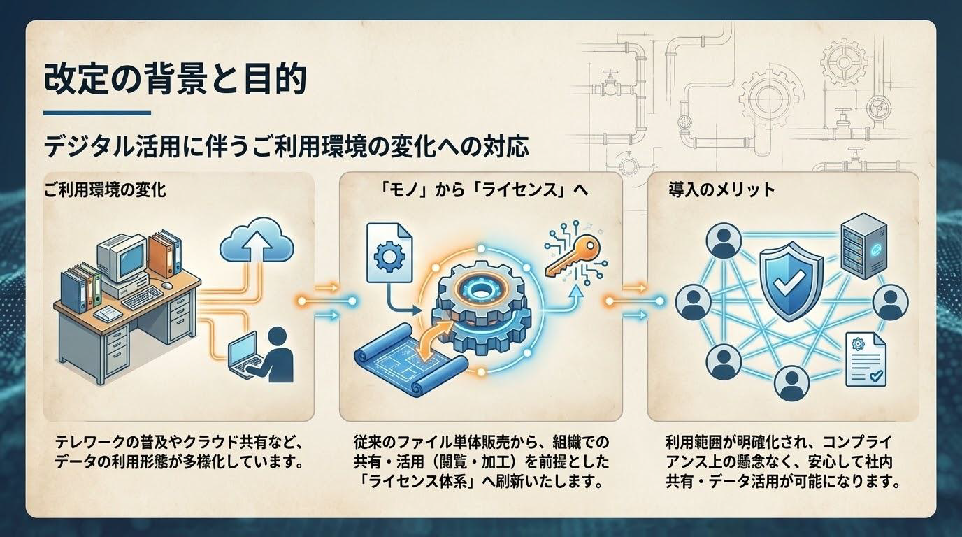 従来のファイル単体販売を、組織での共有・活用を前提としたライセンス体系の販売に刷新するものです。