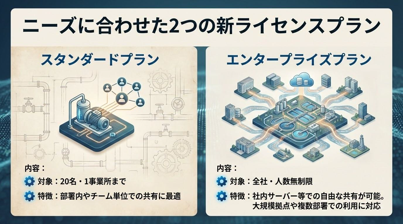 今回のポンプ場ガイド2026販売開始にともない、新しくライセンス販売を実施いたします。近年のデジタル活用に伴うご利用環境の変化に対応し、”社内共有”といったニーズに明確に応えるための改定で、コンプライアンス上の懸念なく、安心して社内共有・データ活用が可能になります。詳しくはこちら