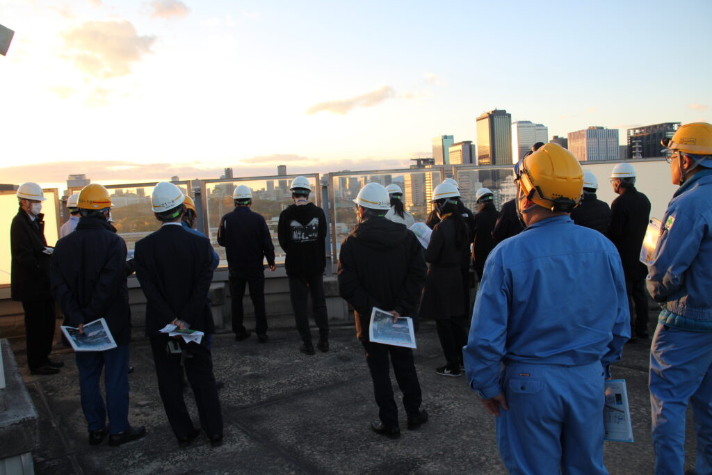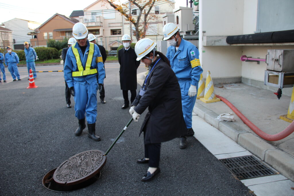 現場見学では、中浜下水処理場におけるMBR(膜分離活性汚泥法)施設や高速ろ過施設などの各工程を見てまわったほか、敷地内でマンホール蓋の開閉作業を体験。管口カメラなど下水道管の点検・調査技術のレクチャーも受けた。地上6階建ての新ポンプ棟の屋上にのぼり、これから再構築が本格化する西系施設の現状や、隣接する大阪公立大学の新キャンパス、2028年に開業する新駅などの状況も観察した。同処理場では西系の再構築に合わせて上部空間利用など周辺のまちづくりと連携した取り組みも予定している。
