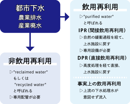 水の再利用には、非飲用再利用(non-potable reuse)と飲用再利用(potable reuse)の二つの大きなカテゴリーがあります。