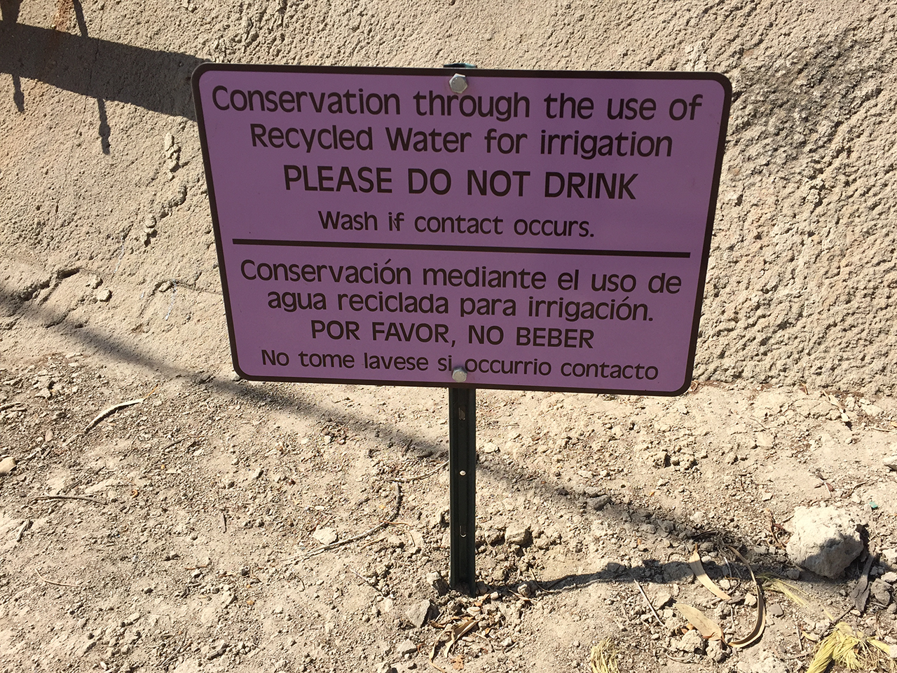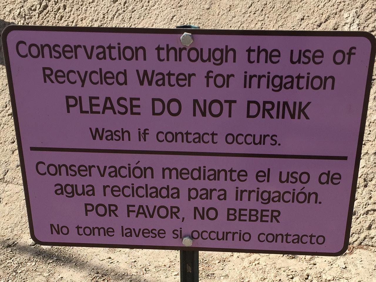 また、再生水の灌漑は春~秋に集中するため、水需要の季節的な変動が大きな課題となります。冬季など利用が少ない時期には処理水が余剰となり、結果として再利用率が低下することもあります。このため、再生水の貯留容量を確保し、工業利用や冷却用途など年間を通じて利用できる用途の設定など、効率的な供給計画が求められます。また、灌漑等で再生水が利用される場合、誤飲を防ぐために写真3のような看板などが必要です。