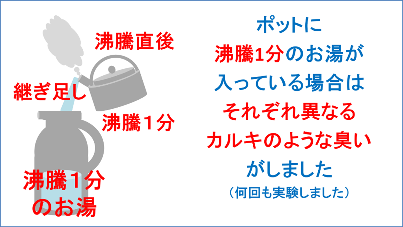 ところが、ポットに沸騰1分のお湯が入っている場合は、沸騰直後のお湯を継ぎ足したときと、沸騰1分のお湯を継ぎ足したときで、それぞれ異なるカルキのような臭いがしました。ポットのお湯を沸騰2分、沸騰5分のお湯に変えても同様でした。理由は不明ですが、これは新しい発見でした。