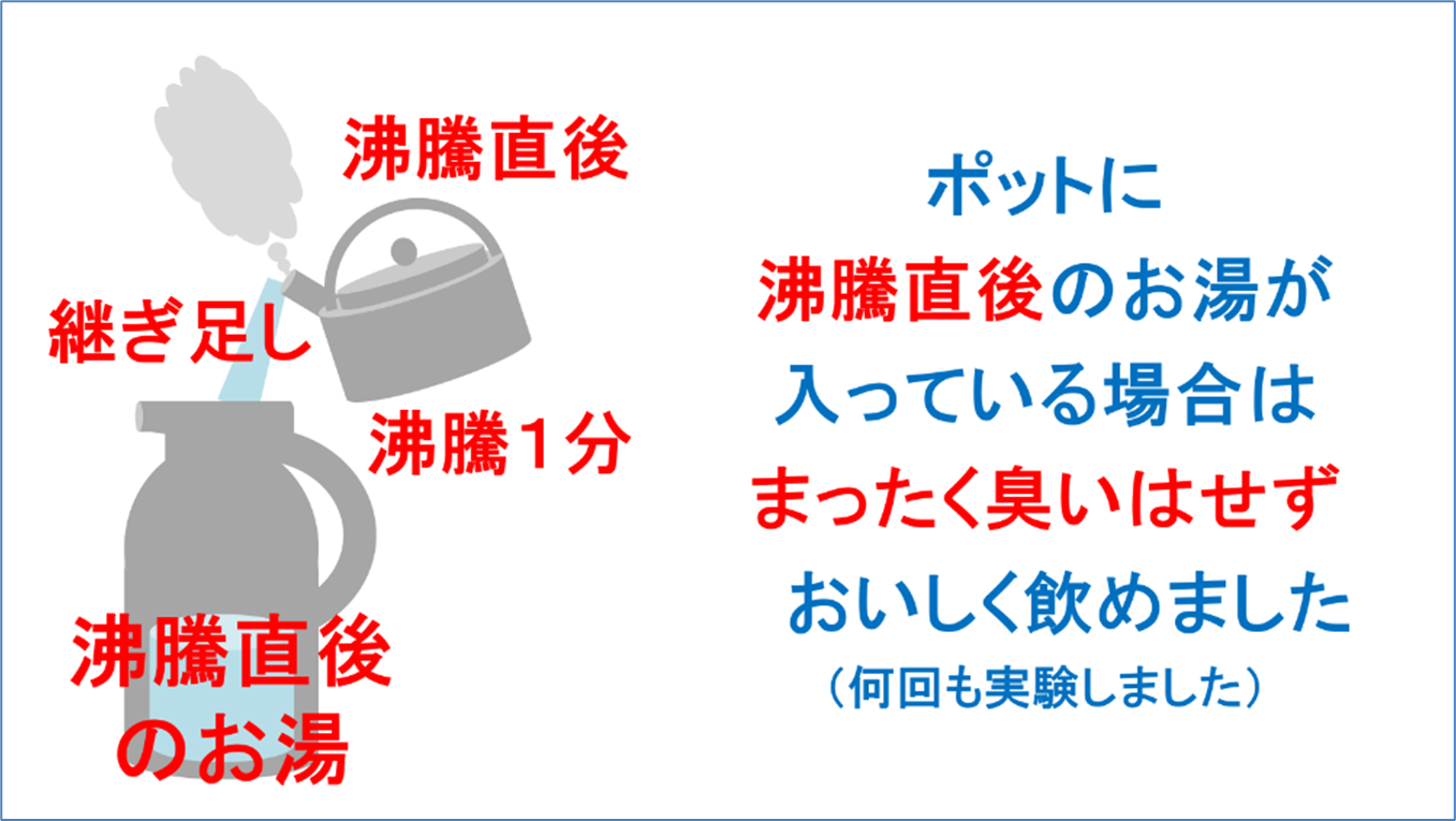 結果です。ポットに沸騰直後のお湯が入っている場合は、沸騰直後のお湯を継ぎ足しても、沸騰1分のお湯を継ぎ足しても、まったく臭いはせず、おいしく飲めました。