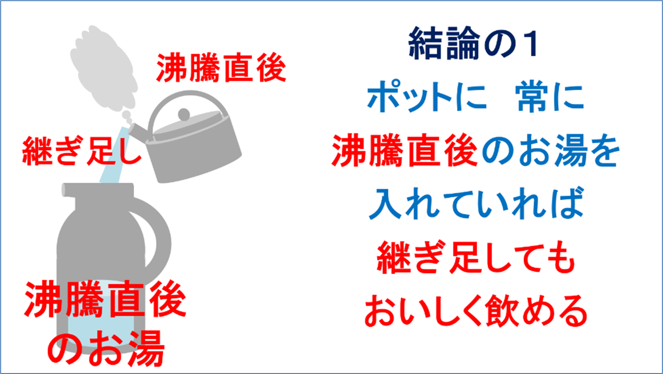 結論の1です。ポットに常に沸騰直後のお湯を入れていれば、継ぎ足してもおいしく飲めます。