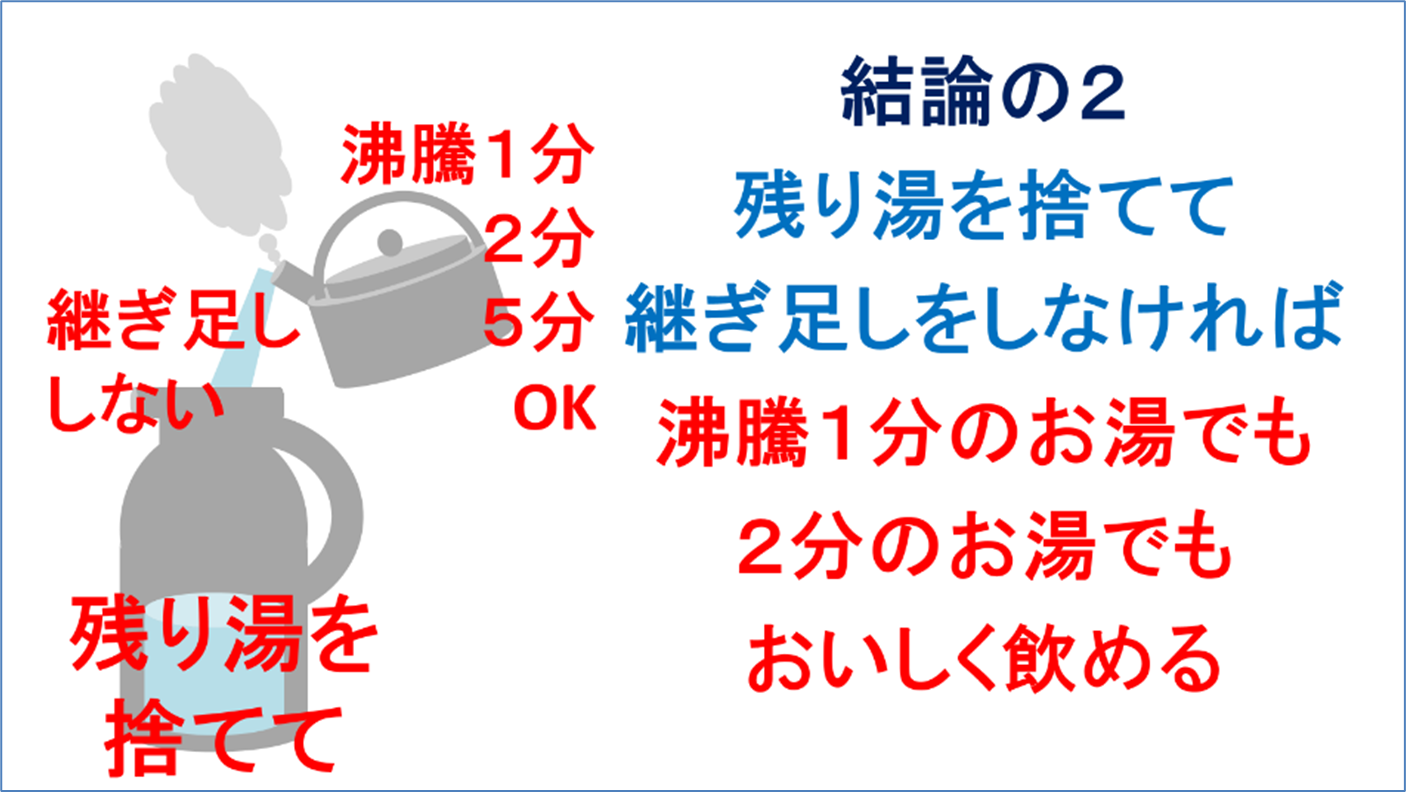 結論の2です。残り湯を捨てて、継ぎ足しをしなければ、沸騰時間を気にする必要がなく、おいしく飲めます。