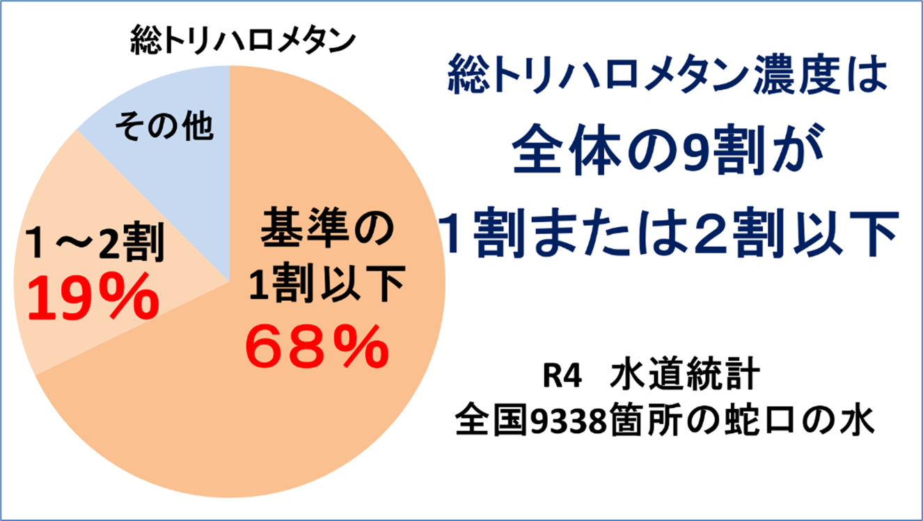 トリハロメタンは消毒用の塩素が有機物と反応してできる物質です。生涯飲んでも健康に影響ない厳しい基準に設定されています。実際の水道水の濃度はこの基準よりもずっと低く、水道統計によると全国9300地点の9割が基準の2割以下の水準です。