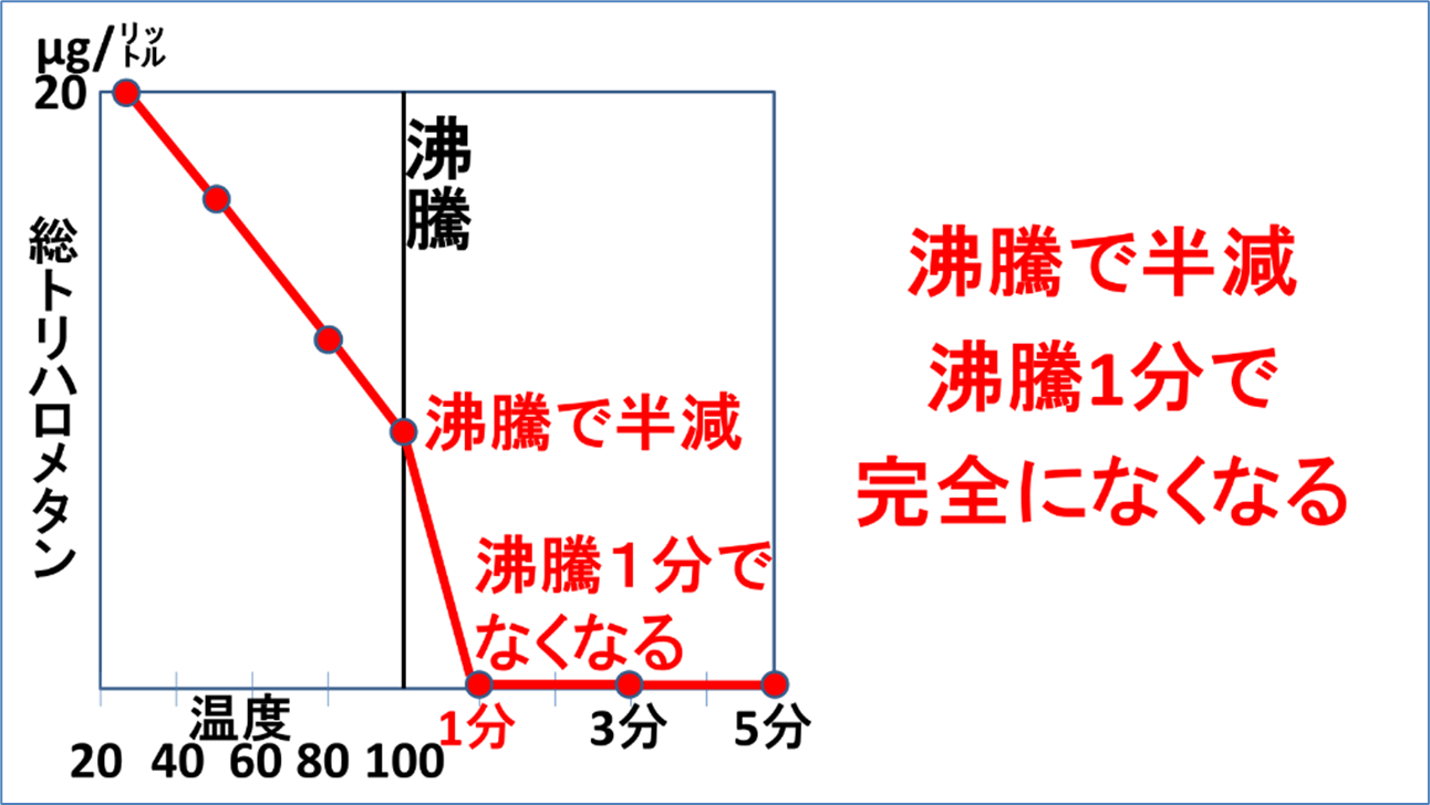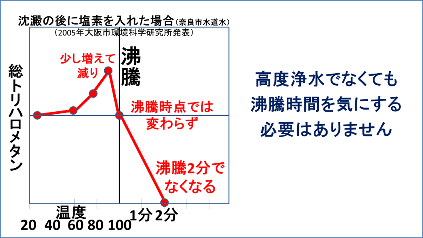 また、高度浄水でなくても昔と違って塩素は沈澱の前でなく後に入れる場合が多くトリハロメタン濃度は低水準です。その場合も先ほどの学会誌で発表していて、トリハロメタンは沸かすと少し増えますが、沸騰前に減り、沸騰2分でなくなるということです。つまり、沸騰で増えることはなく、沸騰時間を気にする必要は全くないということです。