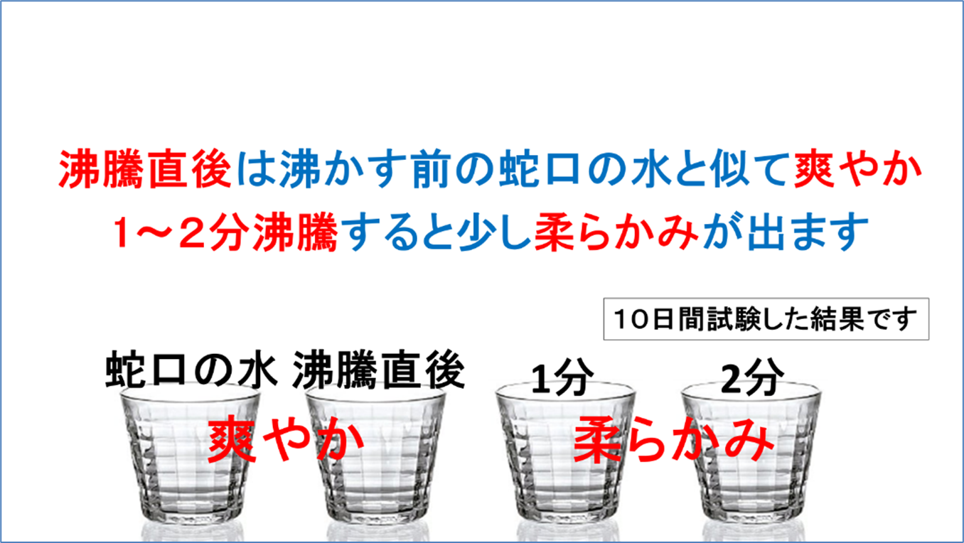次は、沸騰時間によるおいしさの違いです。沸騰後1分ごとのお湯を冷まして飲み比べたところ、沸騰直後は沸かす前の蛇口の水と似て爽やかです。1~2分沸騰すると少し柔らかみが出ます。