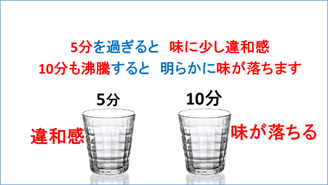 5分を過ぎると味に少し違和感が出て、10分も沸騰すると濃縮されて硬度も上がり明らかに味が落ちます。