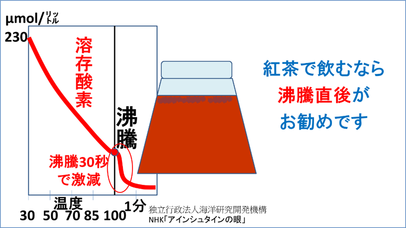また、紅茶で飲むなら、茶葉をジャンピングさせる溶存酸素が、沸騰30秒で激減するので、沸騰直後がお勧めです。沸騰近い温度で溶存酸素があると茶葉がジャンピングして紅茶をおいしく入れることができます。