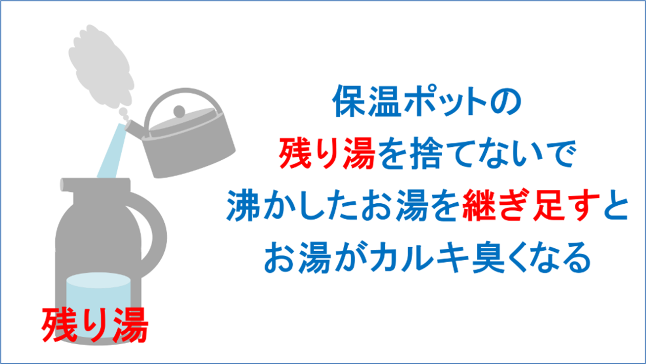 次は保温ポットの継ぎ足しについてです。以前、保温ポットの残り湯を捨てないで、沸かしたお湯を継ぎ足したとき、お湯がカルキ臭くなることに気が付きました。