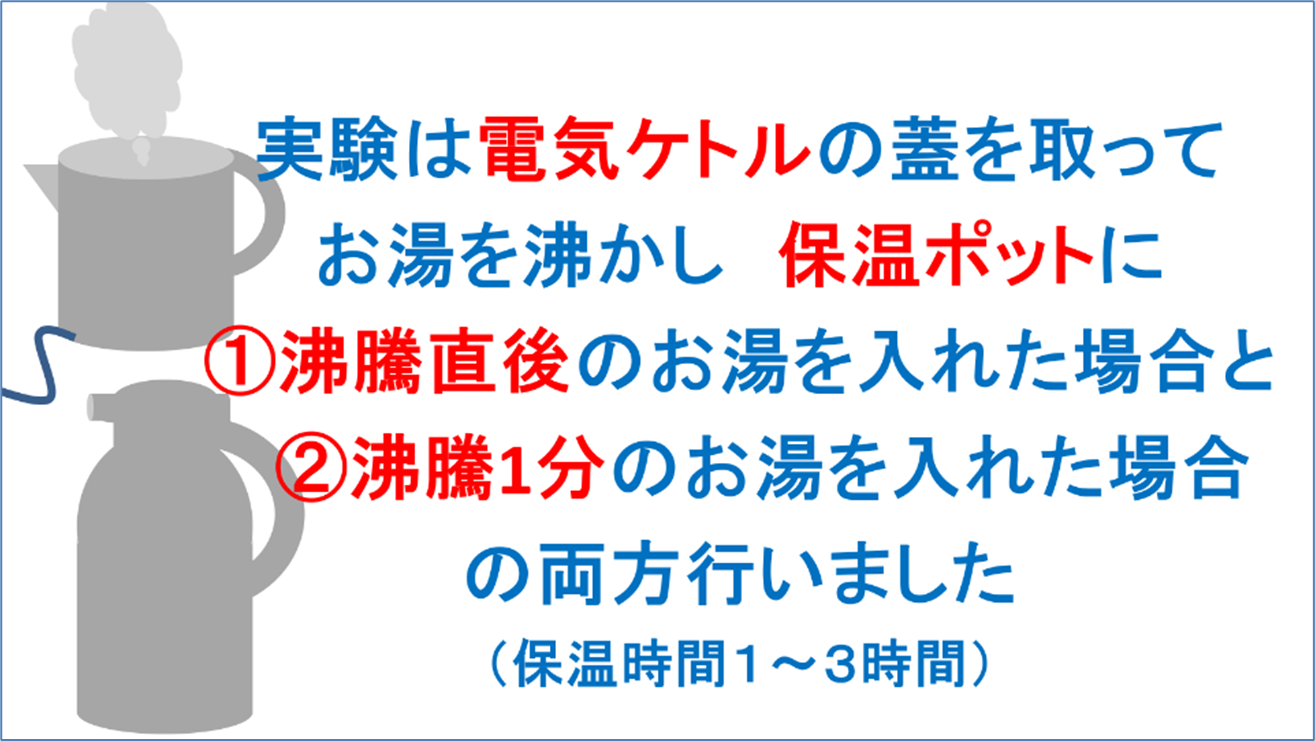 そこで、実験を何回も繰り返して確かめました。実験は電気ケトルの蓋を取ってお湯を沸かし、保温ポットに、①沸騰直後のお湯を入れた場合と、②沸騰1分のお湯を入れた場合、の両方行いました。