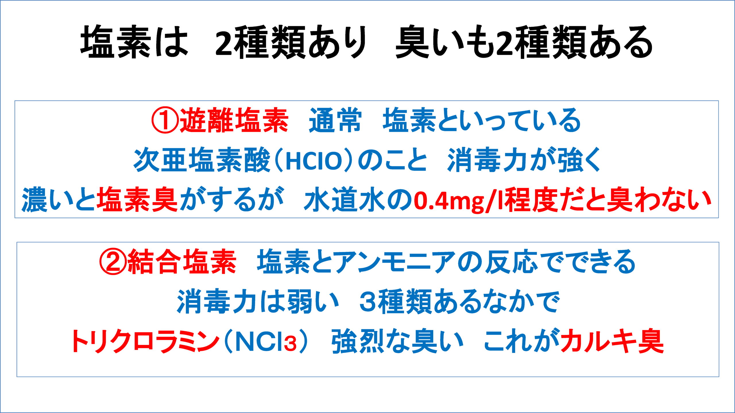 まず、水道の塩素は2種類あって、臭いも2種類あることからお話しします。