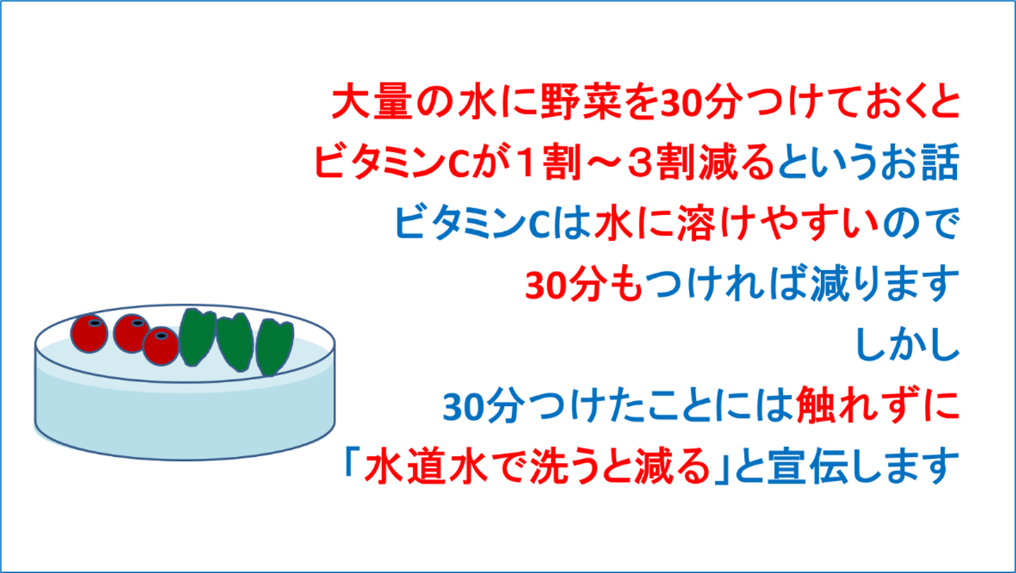 このほかに、野菜を水道水で洗うとビタミンCが減ることも宣伝に使われます。これは20年以上前の、ある大学の実験が元です。大量の水に野菜を30分つけておくとビタミンCが1~3割減るというお話です。ビタミンCは水に溶けやすいので、30分もつければ減ります。しかし、30分つけたことには触れずに「水道水で洗うと減る」と宣伝します。