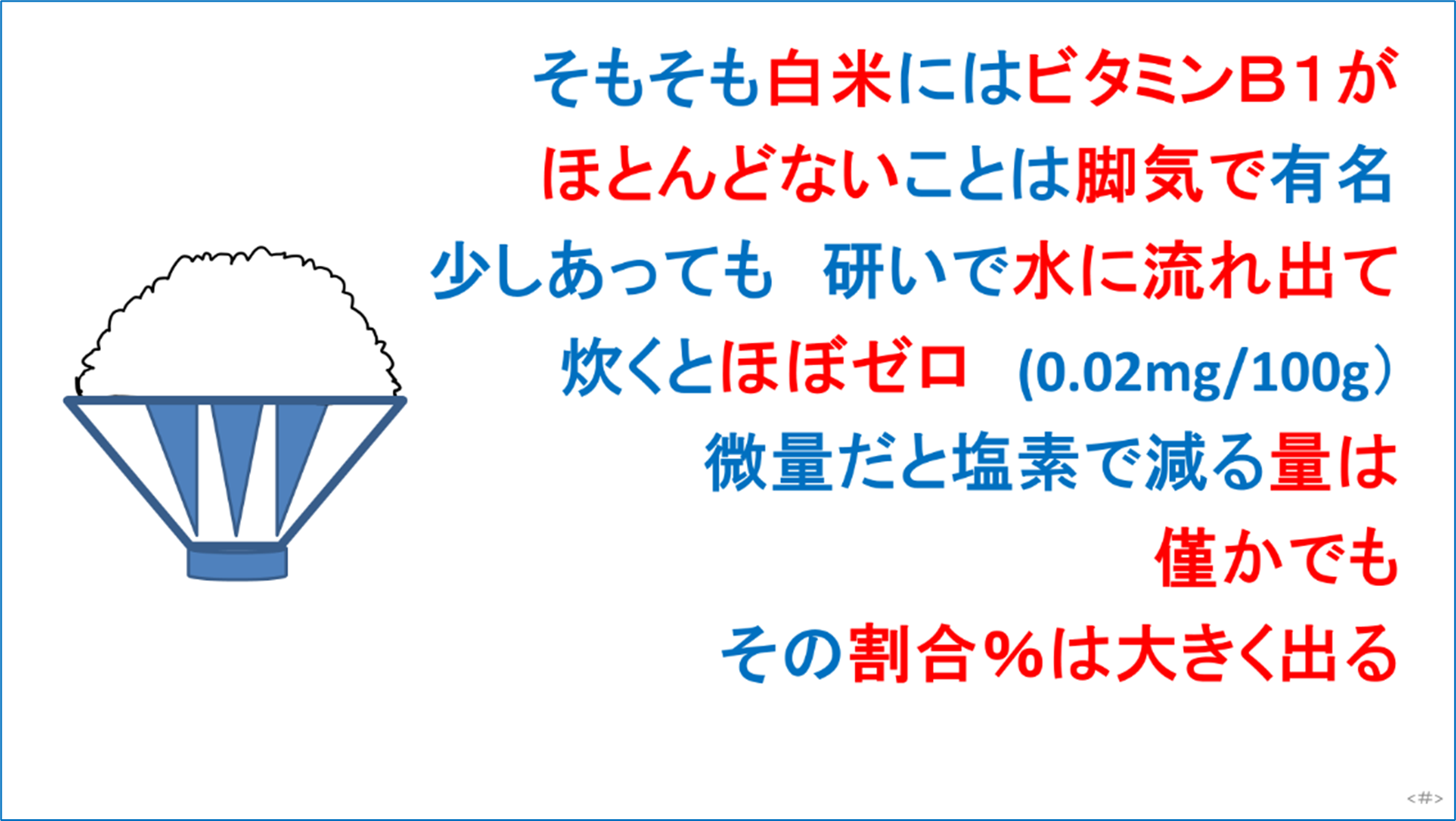 水道水で白米を研いだり炊いたりすると、ビタミンB1が減るとの宣伝もあります。そもそも白米にはビタミンB1がほとんどないことは脚気で有名です。少しあっても研いで水に流れ出て、炊くとほぼゼロです(0.02mg/100g)。そこが彼らの狙いです。微量だと塩素で減る量は僅かでも、その割合%は大きく出るからです。