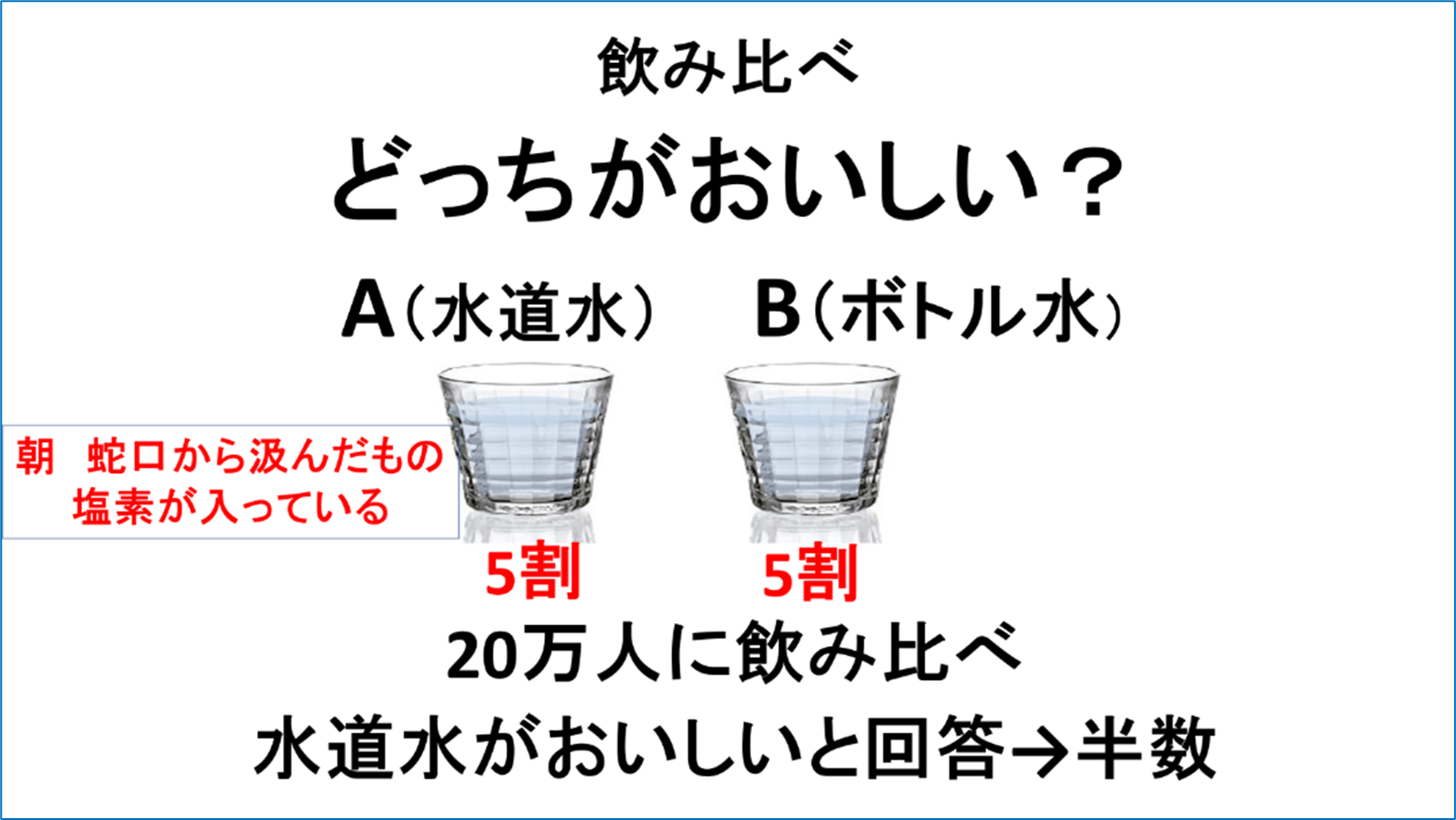 以前、街角で高度浄水した水道水と、人気のボトル水を並べて、どちらが水道水と言わずに、皆さんに飲み比べてもらい、どちらがおいしいか言ってもらったことがあります。20万人以上の方に飲み比べてもらいましたが、水道水がおいしいという人が半分いました。この水道水は朝蛇口から汲んだもので塩素は十分に入っているので、その塩素は臭わなかったということです。