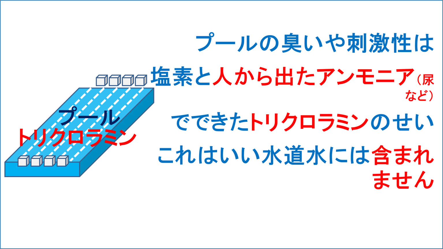 プールも、たいてい強烈なカルキ臭がします。これは人の汗や尿が塩素と反応してトリクロラミンができるからです。よく塩素があるから「目にしみて痛い、髪の毛が茶色くなってバサバサになる、肌が荒れる」などと塩素を悪者にしている人がいますが、これらは全てトリクロラミンのしわざです。遊離塩素にそういう働きはありません。
