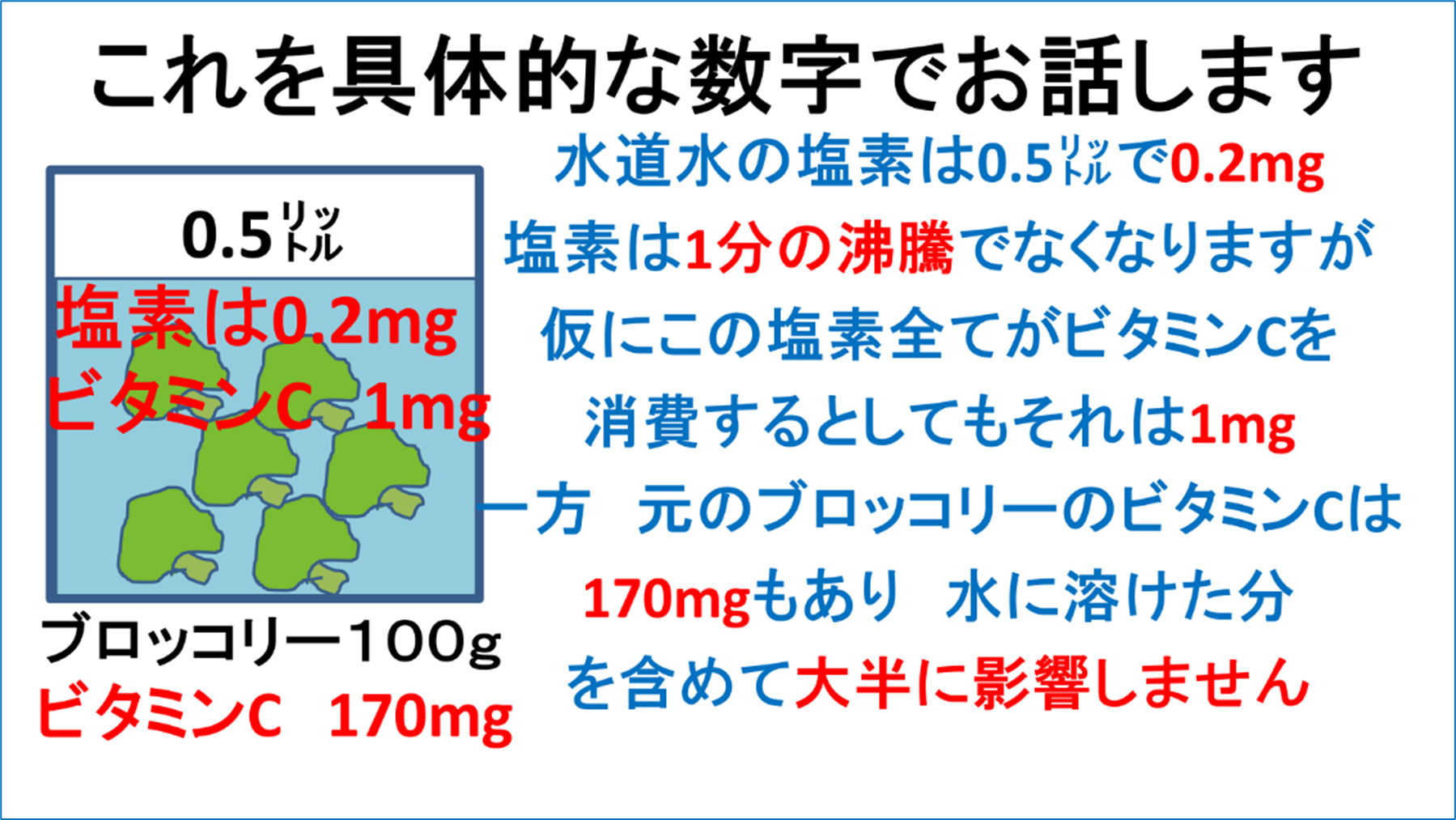 しかし、水道水の塩素はごく微量なので、ビタミンCがなくなるのもごく微量です。大半のビタミンCは残ります。これを具体的に数字でお話します。水道水0.5㍑でビタミンCが豊富なブロッコリーを100g茹でるとします。水道水の塩素濃度は0.4mg/㍑なので、0.5㍑だと塩素は0.2mg含まれます。私の実験では塩素は1分の沸騰でなくなりますが、仮にこの塩素全てがビタミンCを消費するとしてもそれはたった1mgです。一方元のブロッコリーのビタミンCは170mgもあり、大半に影響しません。