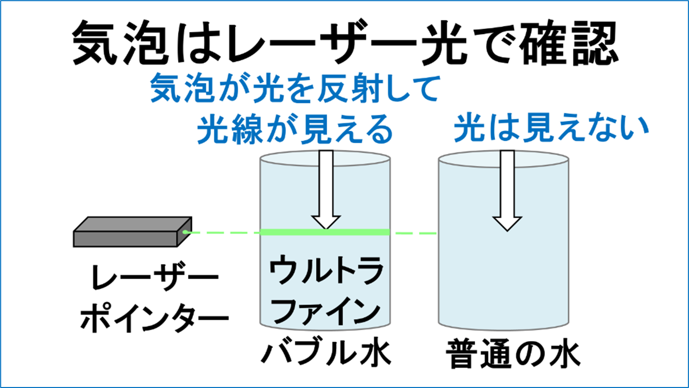 その特徴ですが、マイクロバブルは水中で白濁してそのうち消えるのに対し、ウルトラファインバブルは無色透明で、気泡の寿命は数週間から数か月あるといいます。気泡はレーザー光を当てると確認できます。