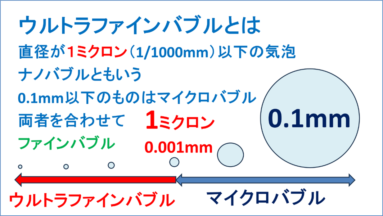 ウルトラファインバブルとは、直径が1ミクロン以下の気泡をいいます。ナノバブルともいいます。これより大きくて0.1mm以下のものはマイクロバブル、両者を合わせてファインバブルといいます。