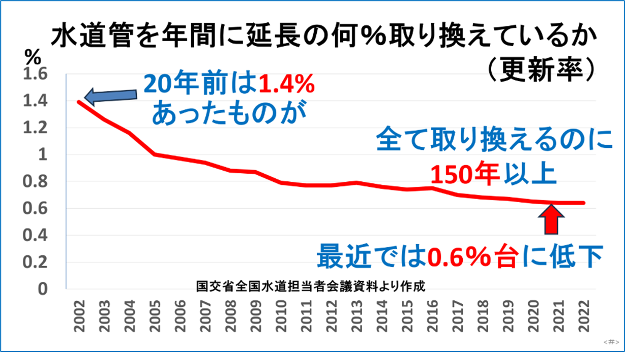 管路延長に対する年間の「更新率」で見ると、20年前には全国平均で年1.4%ありましたが、近年では0.6%台にまで低下しています。