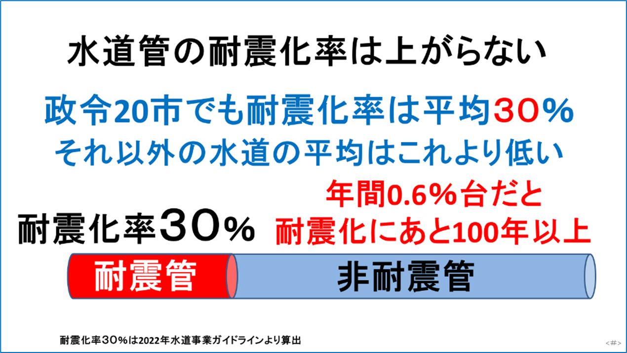 この結果として水道管の耐震化率はなかなか上がりません。比較的高い政令20市でも耐震化率は平均30%で、それ以外の水道事業体の平均はこれより低いのが現実です。仮に耐震化率30%としても、更新率が年間0.6%台だと、残りの管を耐震化するのにあと100年以上かかります。