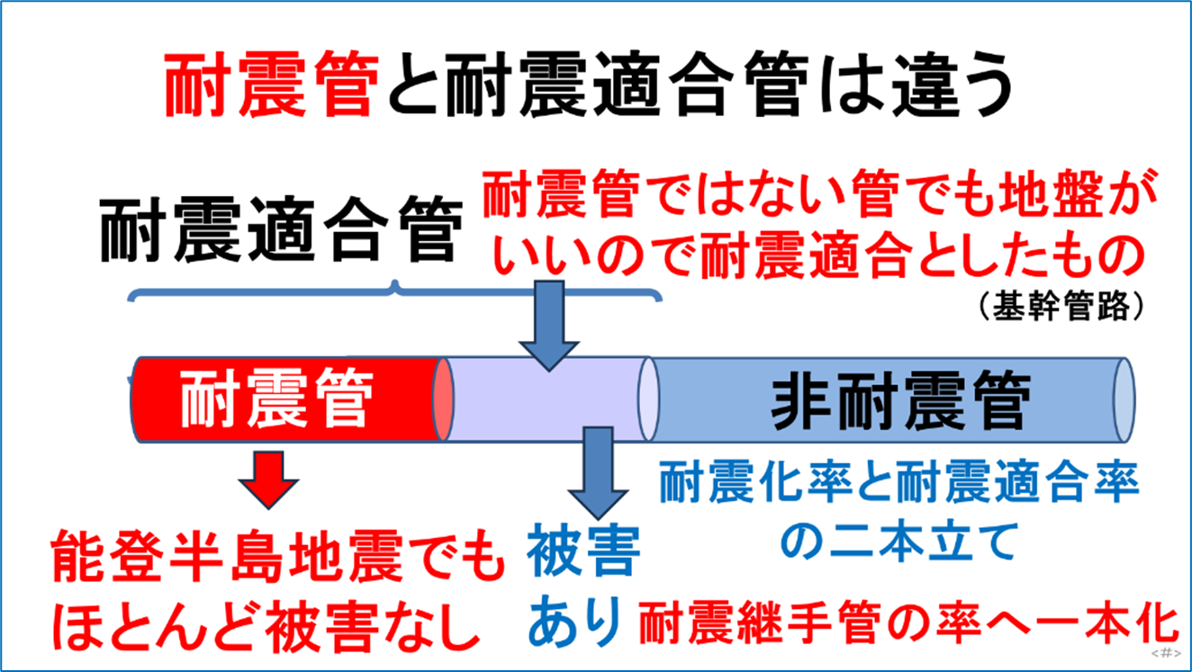 ここで重要なのが、「耐震管」と「耐震適合管」は違うということです。「耐震管」は抜け出し防止機能があって、今回の震災でもほとんど被害がありませんでした。これに対して「耐震適合管」には、非耐震管であっても「地盤が良好」という理由で耐震性ありと判定されたものが含まれます。残念ながら今回の地震では激しい揺れにより、こうした「地盤頼みの耐震適合管」で継手の抜け出しが頻発しました。現行の耐震評価指標は、この二者が混在していて極めて分かりにくいのが実情です。今後は評価指標を「耐震継手管の率」に一本化し、真の耐震化を明確にすべきです。