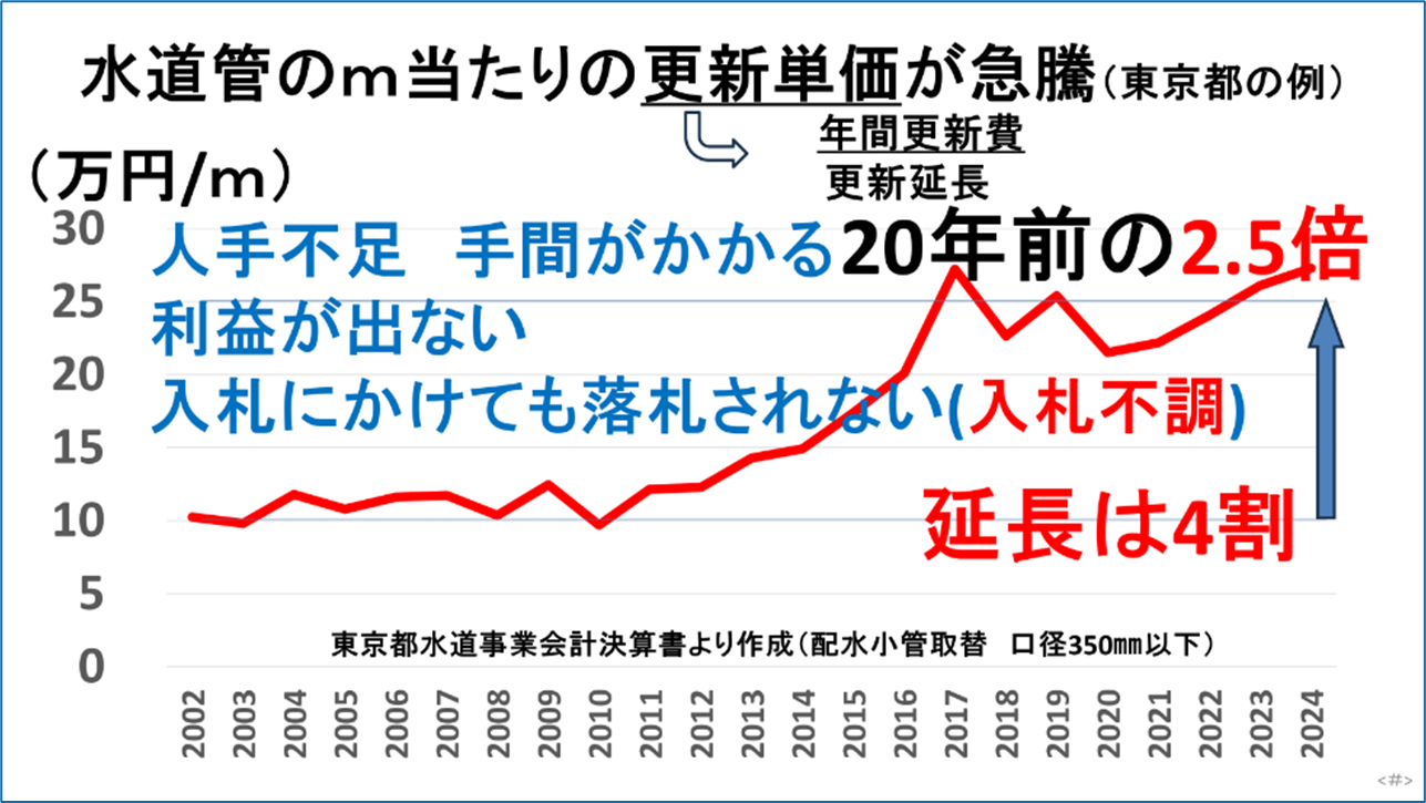 耐震化を阻む要因の一つは、更新単価の急騰です。東京都を例に挙げると、管路1メートルあたりの更新単価(年間更新費÷更新延長)は、20年前の2.5倍に達しています。これでは、20年前と同等の予算を投じたとしても、更新できる延長は当時の4割程度に留まります。背景には、人手不足や採算悪化による「入札不調」の常態化があり、それが工事費の上昇を招いています。