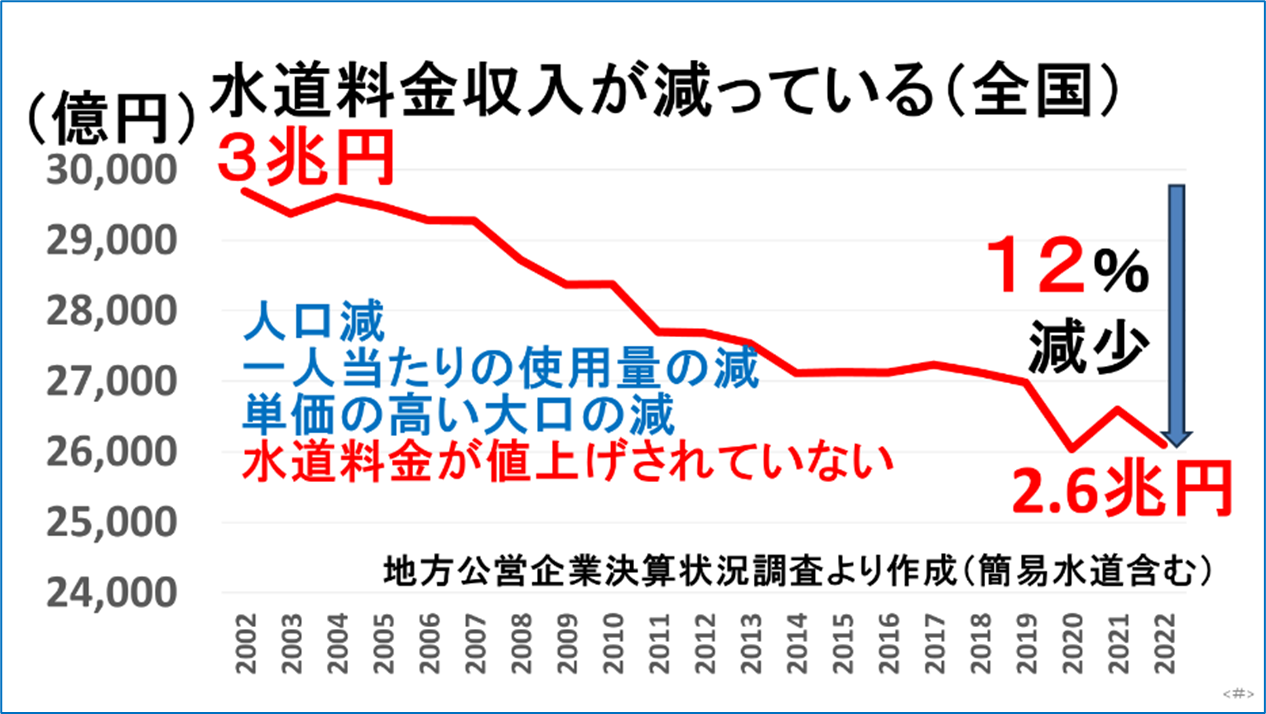 もう一つの決定的な要因は、原資となる水道料金収入の減少です。全国の水道料金収入は、過去20年間で3兆円から2.6兆円へと、約12%も減少しました。その理由は、人口減、一人当たりの使用量の減、単価の高い大口の減、そして長年据え置かれてきた料金改定の先送りです。