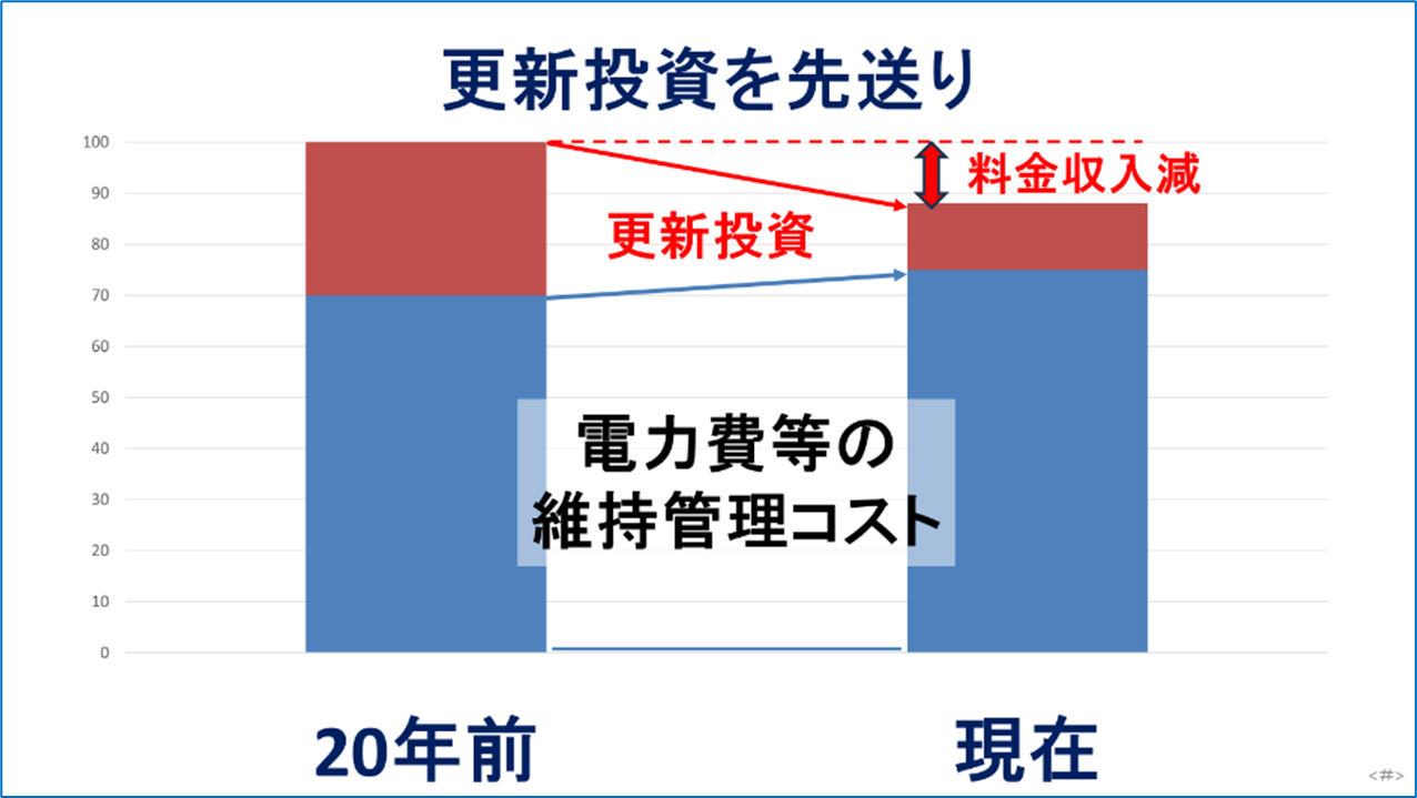 電力費等の維持管理コストが増大する一方で収入が減る現状では、更新投資を先送りせざるを得ない経営判断に追い込まれているのです。