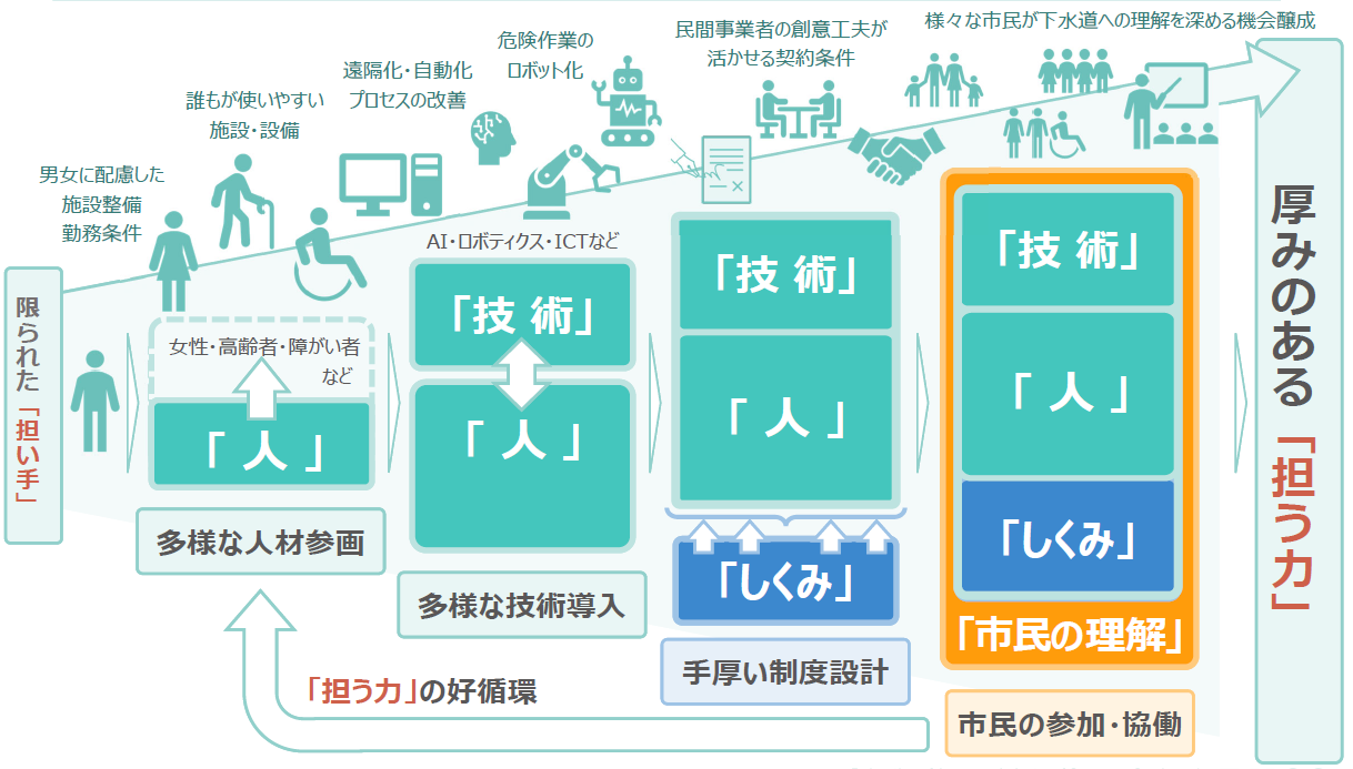 勉強会ではまずFJISSが説明を行い、長期的な視点に立って「人」「技術」「しくみ」「市民の理解」といった多様なアプローチで「担う力」を確保していく必要性を強調するとともに、そのために必要な制度や財政支援を具体的に示しました。「人」については施設・管理棟内など多様な人材に配慮した環境整備・改善、OJTなど人材育成に関する取り組みを発注業務に包含させる支援、「技術」については省人化に資する技術の導入・実装の推進、AI・ロボティクス・ICTなど新技術開発・実装への補助適用、「しくみ」については民間企業が受託しやすい水の官民連携(ウォーターPPP)の推進、人材活用・新技術導入提案の優遇と費用の支援、実施要件・手続き・業務プロセスの見直し・緩和など民間自由度の拡張、「市民の理解」については官民協働による下水道事業現場での市民見学会の開催、小学校のみならず中学・高校・大学を対象とした広報活動の強化、などを挙げました。