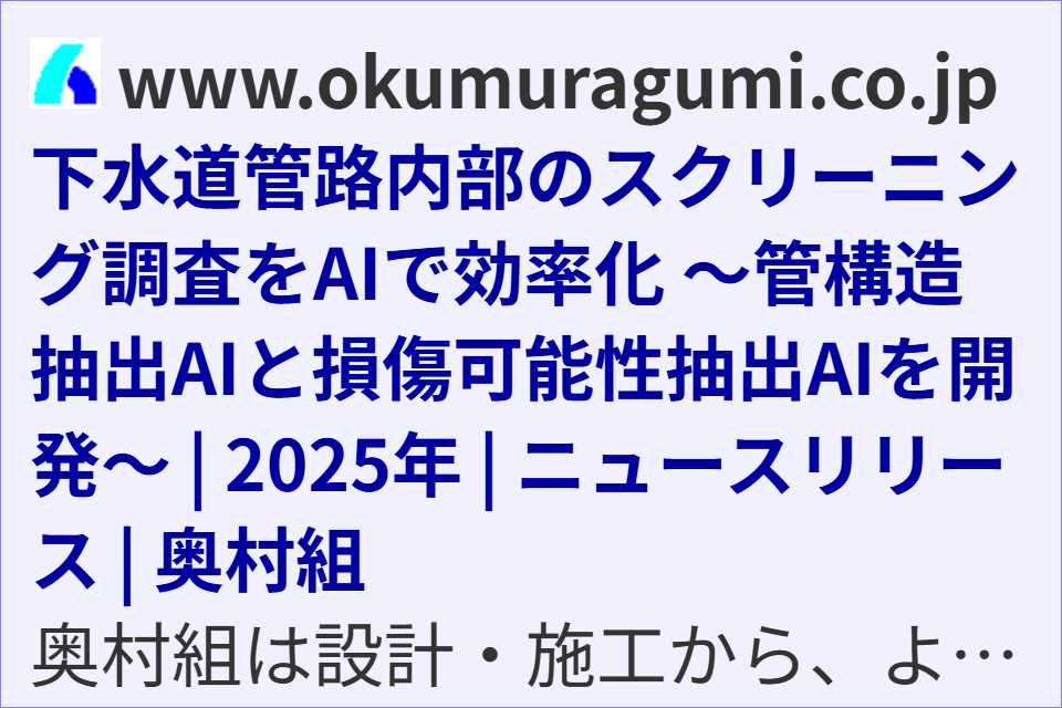 2025.12.15 下水道管路内部のスクリーニング調査をAIで効率化 ~管構造抽出AIと損傷可能性抽出AIを開発~ | 奥村組