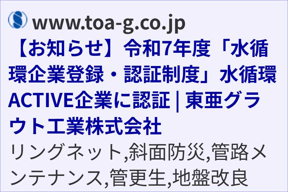 2025.11.10 【お知らせ】令和7年度「水循環企業登録・認証制度」水循環ACTIVE企業に認証 | 東亜グラウト工業